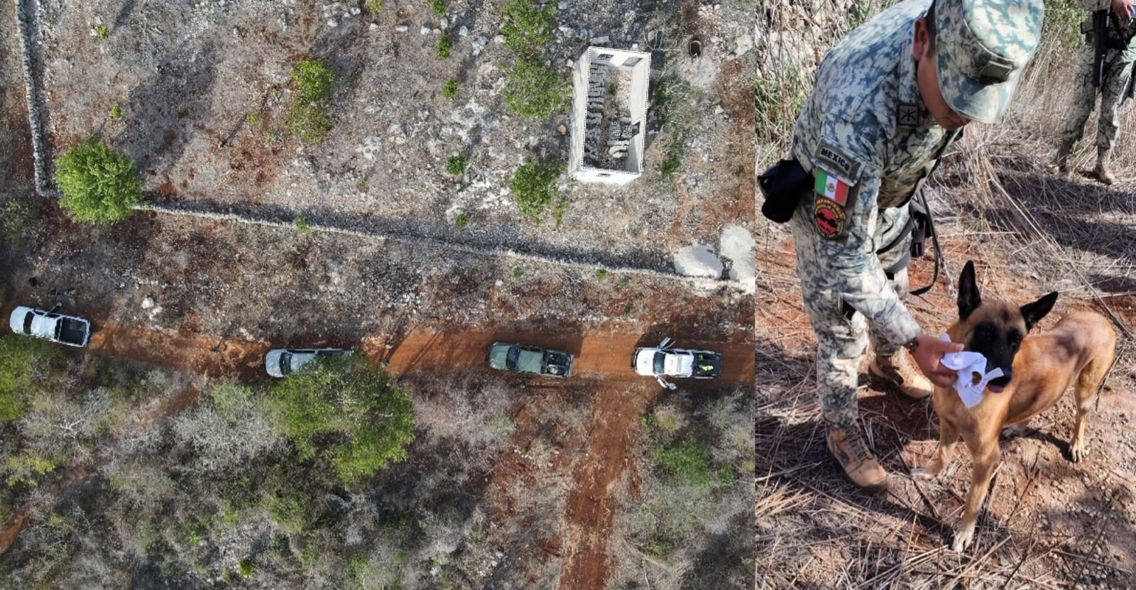 El despliegue incluye equipos especializados con tecnología aérea y terrestre, como un dron de reconocimiento para rastrear áreas amplias de vegetación densa, y binomios caninos K9, entrenados para detectar rastros humanos en campo abierto.